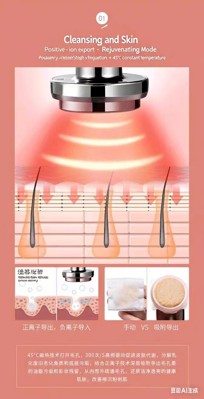 The 45°C magnetocaloric technology opens up pores, while 300-times-per-second high-frequency vibration promotes skin metabolism, decomposing and emulsifying aged keratin and underlying dirt. Combined with positive ion technology, it deeply absorbs and removes grease, dirt, and makeup residues from pores. This works from the inside out to purify the skin, improve dullness and uneven texture, and leave the skin looking refreshed.