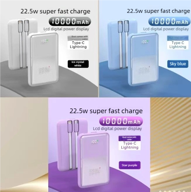 Actual Capacity: 10,000 mAh Rated Capacity: 5,500 mAh Power: 22.5W Super Fast Charging Colors: White, Purple, Blue TYPE-C Input: 5V/3.0A, 9V/2A, 12V/1.5A USB Output: 5V/3.0A, 9V/2A, 12V/1.5A, 22.5W (max) Type-C Built-in Cable Output: 5V/3.0A, 9V/2A, 12V/1.5A, 22.5W (max) Lightning Built-in Cable Output: 5V/3A, 9V/2.22A, 12V/1.67A (20W MAX)