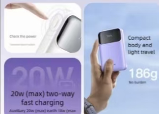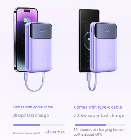 Shows power banks in different colors (such as purple, black, white). Some models come with a retractable charging cable.