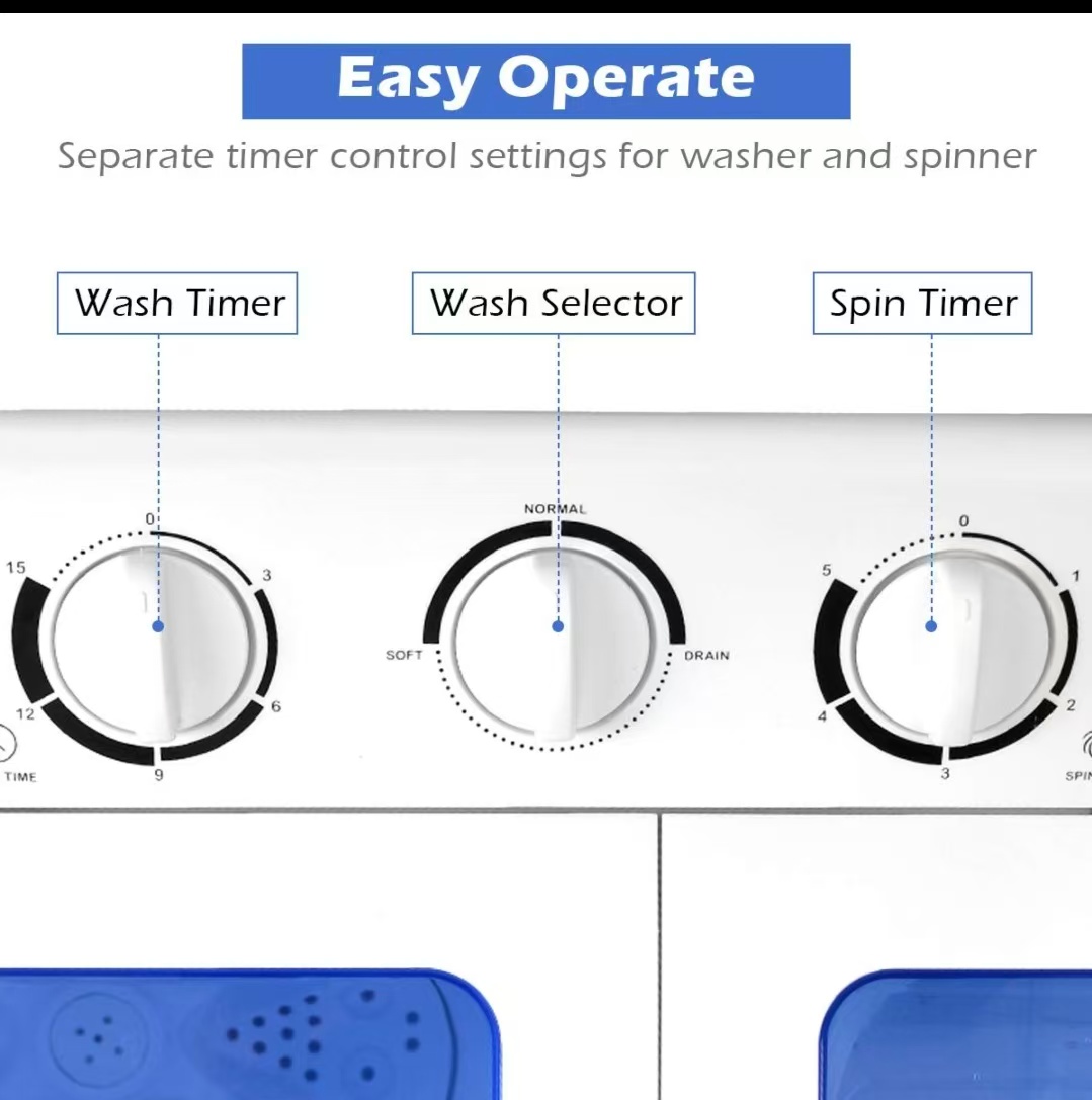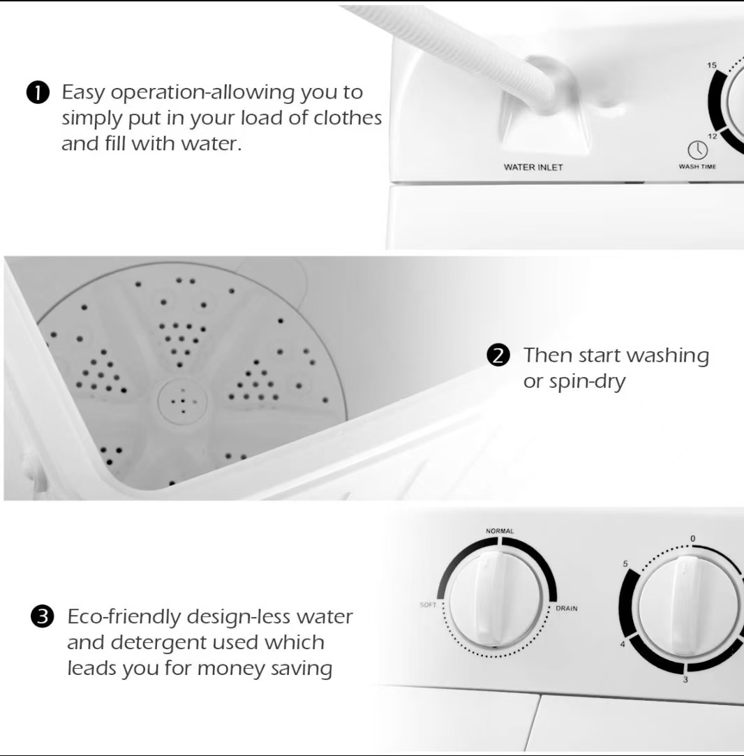 Easy operation – simply load your clothes, fill with water, then start washing or spin-drying
