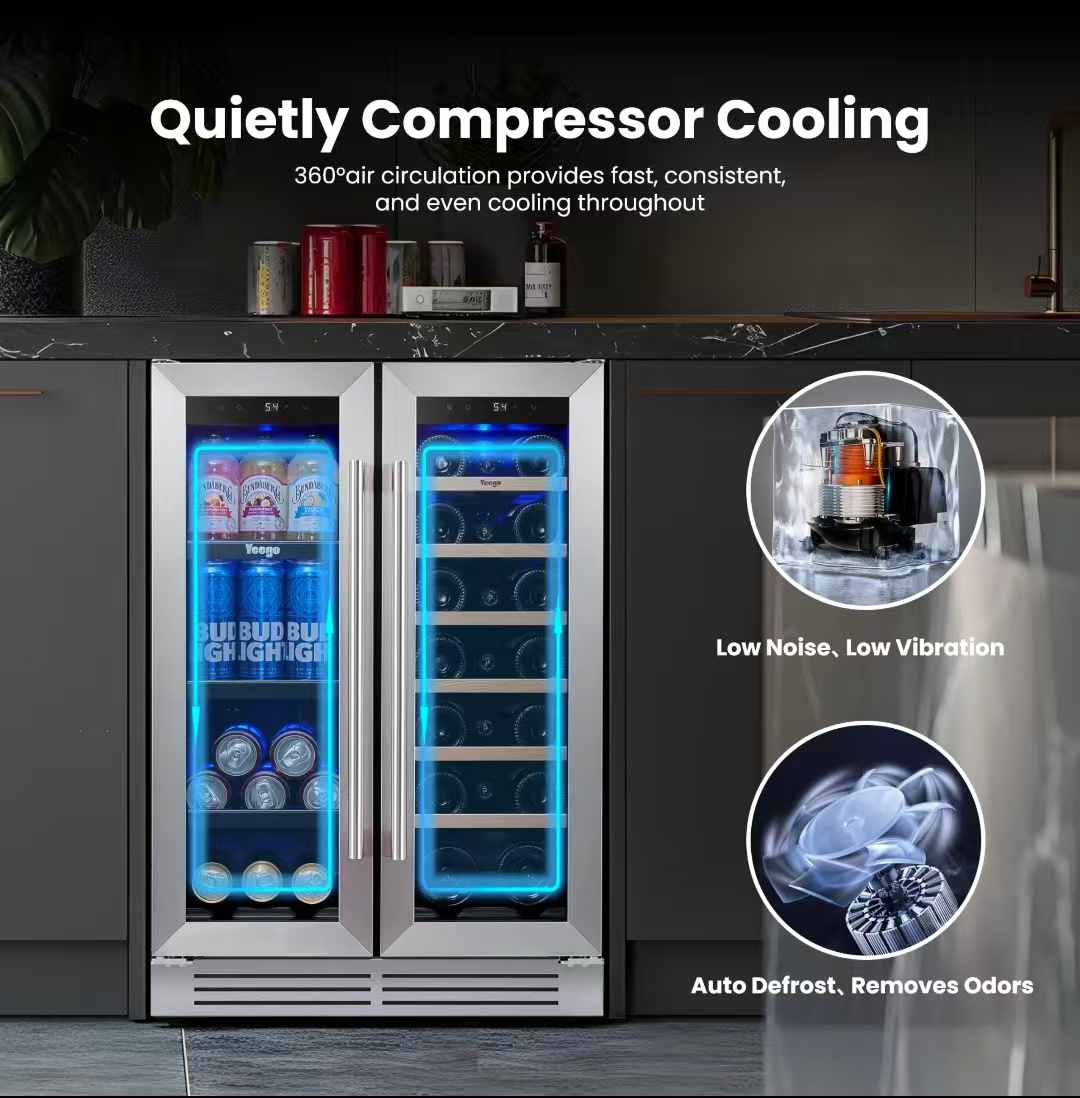 – Storage Capacity: Can hold 60 cans and 20 bottles, with adjustable space to fit various-sized bottles (60 cans are 12oz/355ml, 20 bottles are 750ml Bordeaux bottles). It is equipped with 3 wire racks and 6 wooden racks.